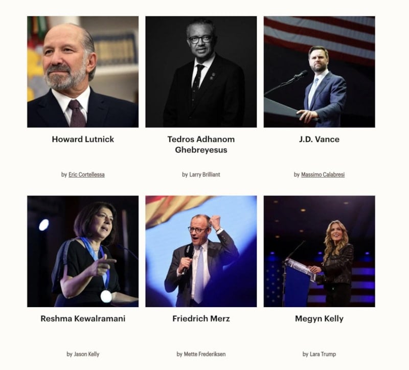 Miuccia Prada, Yoshitomo Nara, Mickalene Thomas, Annabelle Selldorf, Ma Yansong, Willy Chavarria, Percival Everett, Amy Griffin, Miranda July, Branden Jacobs-Jenkins, Kwame Onwuachi, Chutatip "Nok" Suntaranon, David Muir, Megyn Kelly, Joe Rogan, Lisa Su, Mark Zuckerberg, Bonnie Y. Chan, Alex Karp, Jonathan Greenblatt, Stephen J. Squeri.