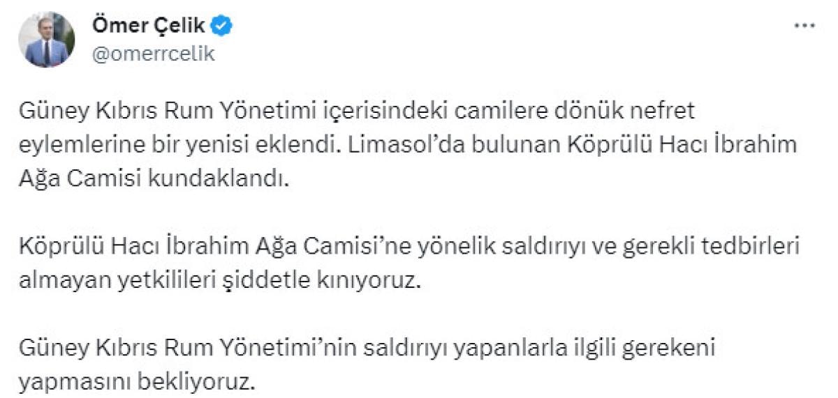 AK Parti Genel Başkan Yardımcısı ve Parti Sözcüsü Ömer Çelik, sosyal medya hesabından yaptığı açıklamada, camilere dönük nefret eylemlerine yenisinin eklendiğini belirtti.