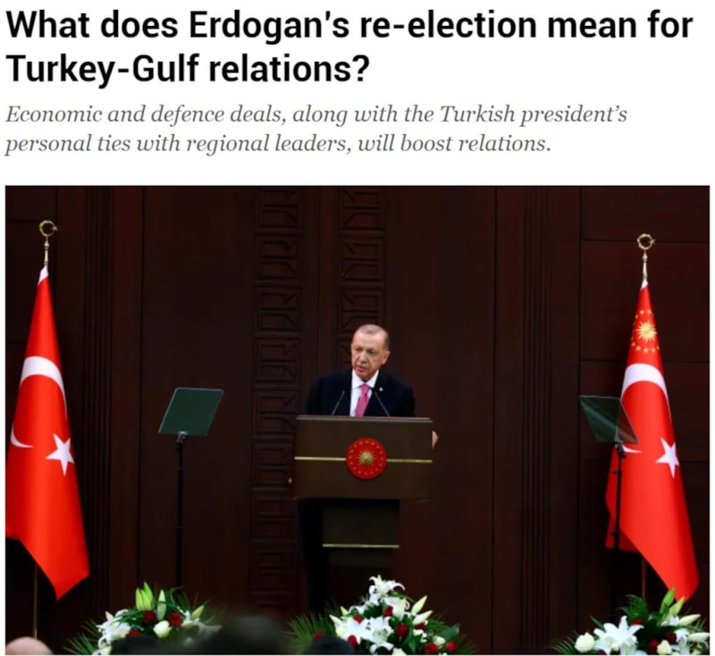 Erdoğan'ın yeniden seçilmesinin birçok Körfez yetkilisini "rahatlattığı" belirtilerek, "Çünkü rakibi Kemal Kılıçdaroğlu, Türkiye'nin KİK'e yönelik dış politikasını çıkarlarını baltalayacak şekilde muhtemelen değiştirmiş olacaktı." denildi.