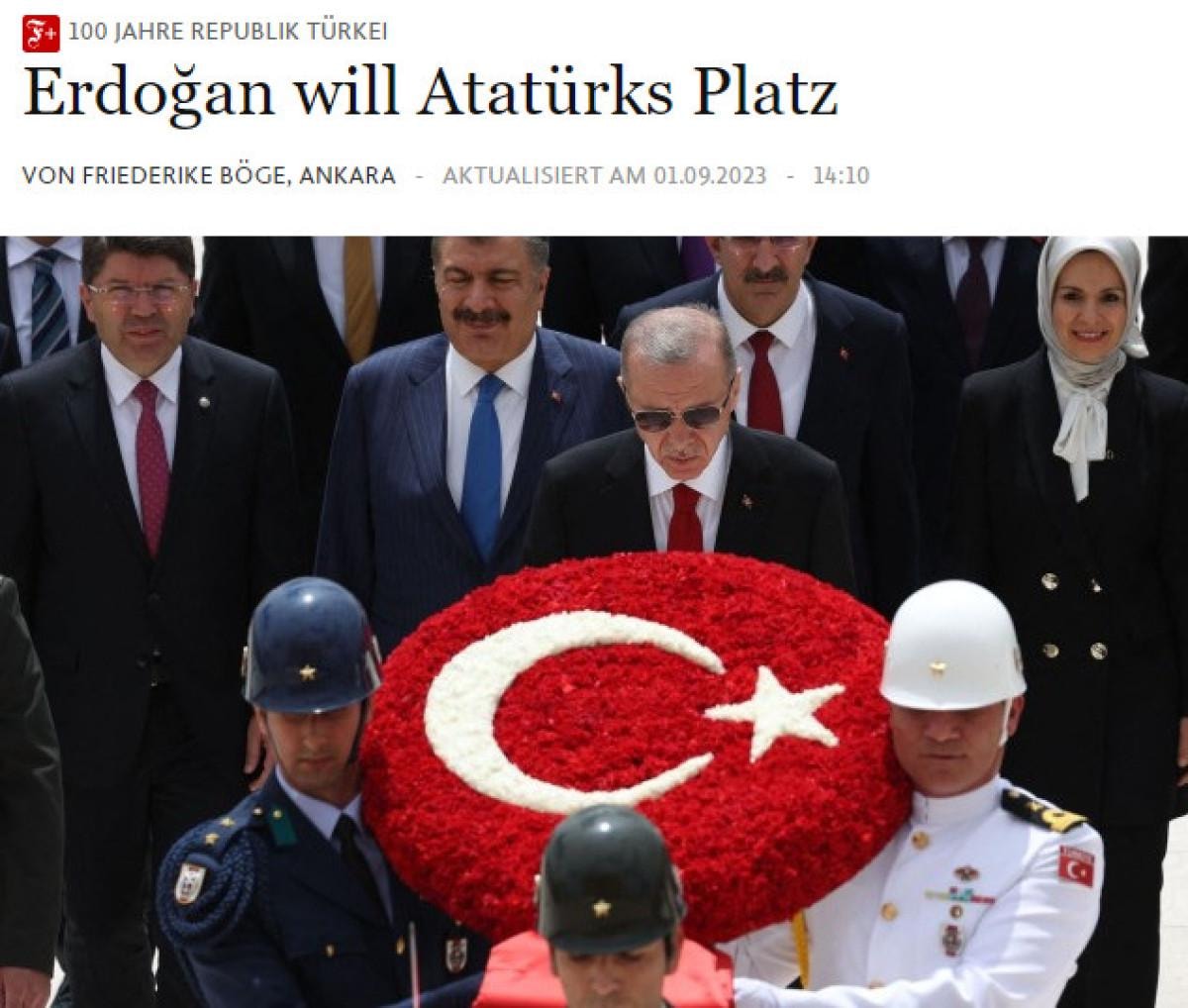 Frankfurt merkezli Frankfurter Allgemeine Zeitung (FAZ), "Erdoğan, Atatürk'ün yerini istiyor" başlıklı görüş yazısında 29 Ekim Cumhuriyet Bayramı kutlamalarına dikkati çekti.