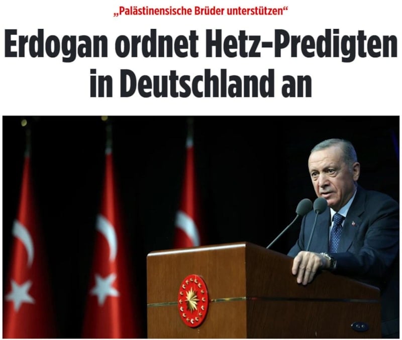 "Erdoğan, Almanya'da kışkırtıcı vaazlar verdi" şeklinde ifadeler kullanan gazete, “Filistinli kardeşlerini destekliyor." diye yazdı.