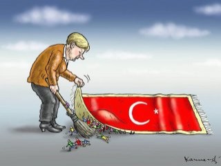 Alman karikatürist Marian Kamensky, Almanya Başbakanı Angela Merkel’in mülteci politikasını eleştiren bir karikatür çizdi. Karikatürde Türkiye bayrağı işlemeli bir seccadenin altına mülteciler süpürülüyor.