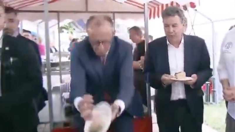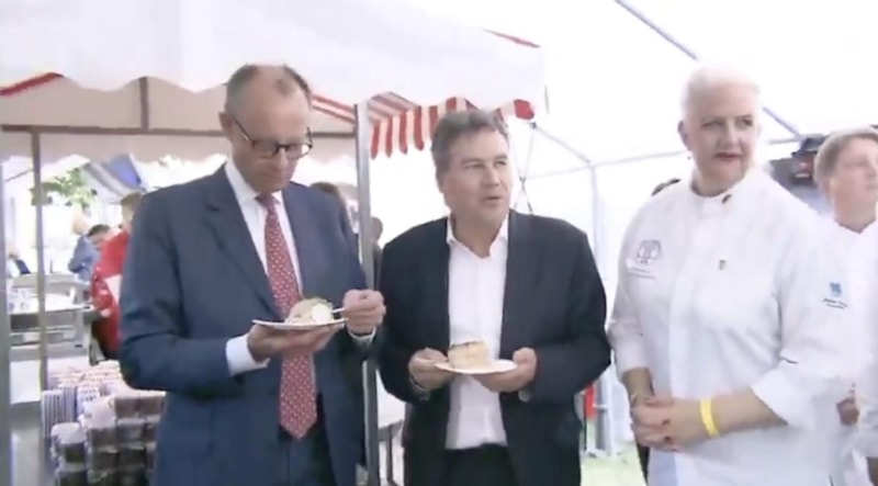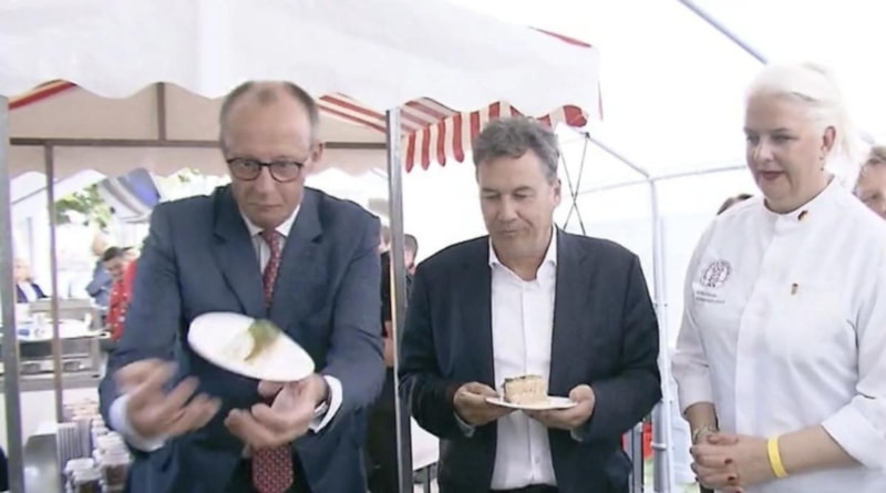 Hristiyan Demokratlar (CDU) parlamento grubunun küçük ve orta ölçekli işletmelerle ilgili yıllık yaz partisine katılan Almanya Başbakanı Friedrich Merz, Almanya haritasına benzer şekilde hazırlanmış pastanın bir dilimini elinden düşürdü.