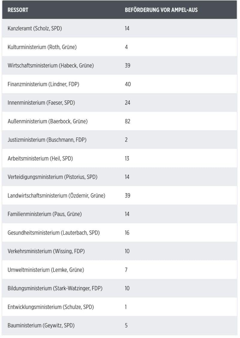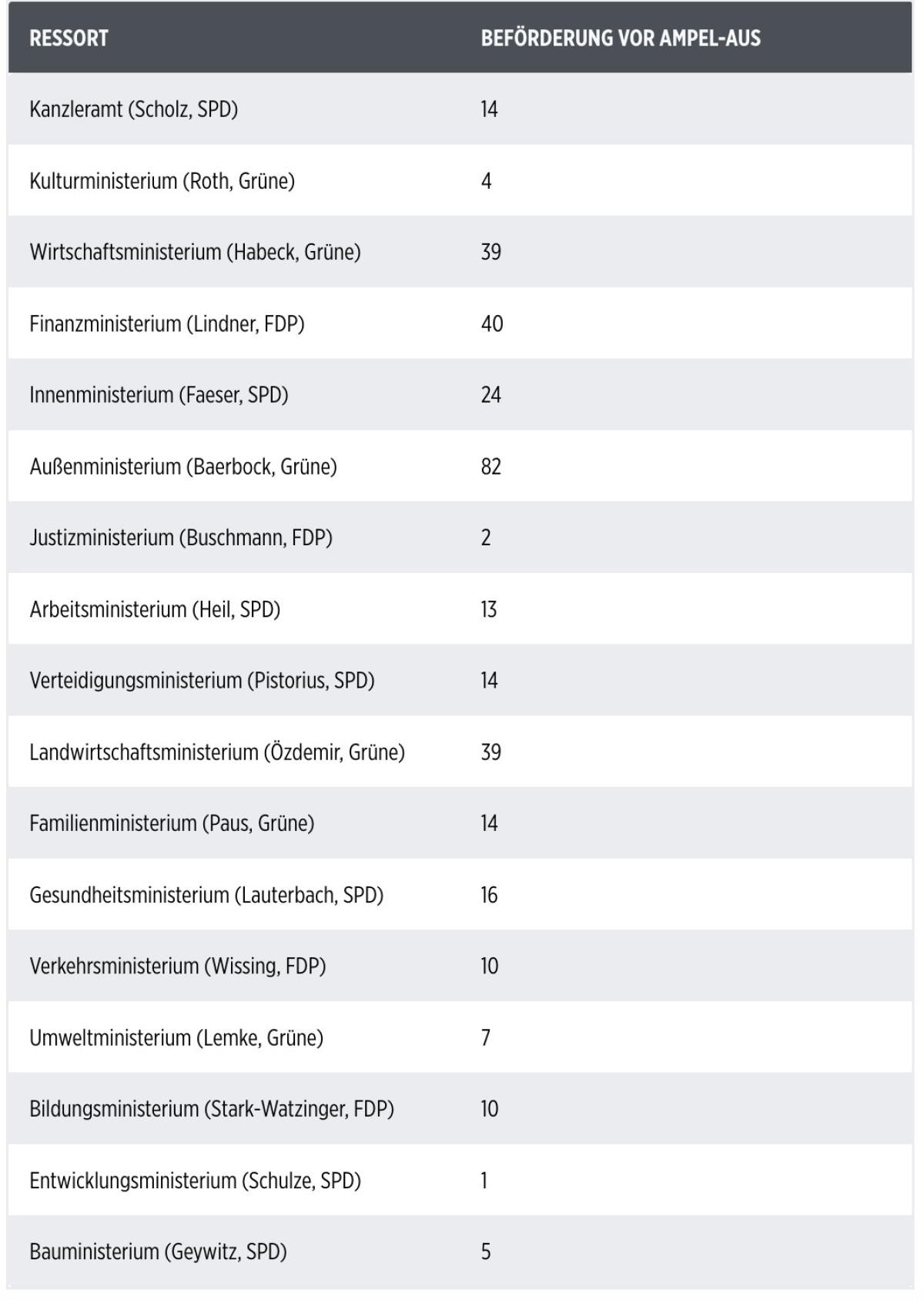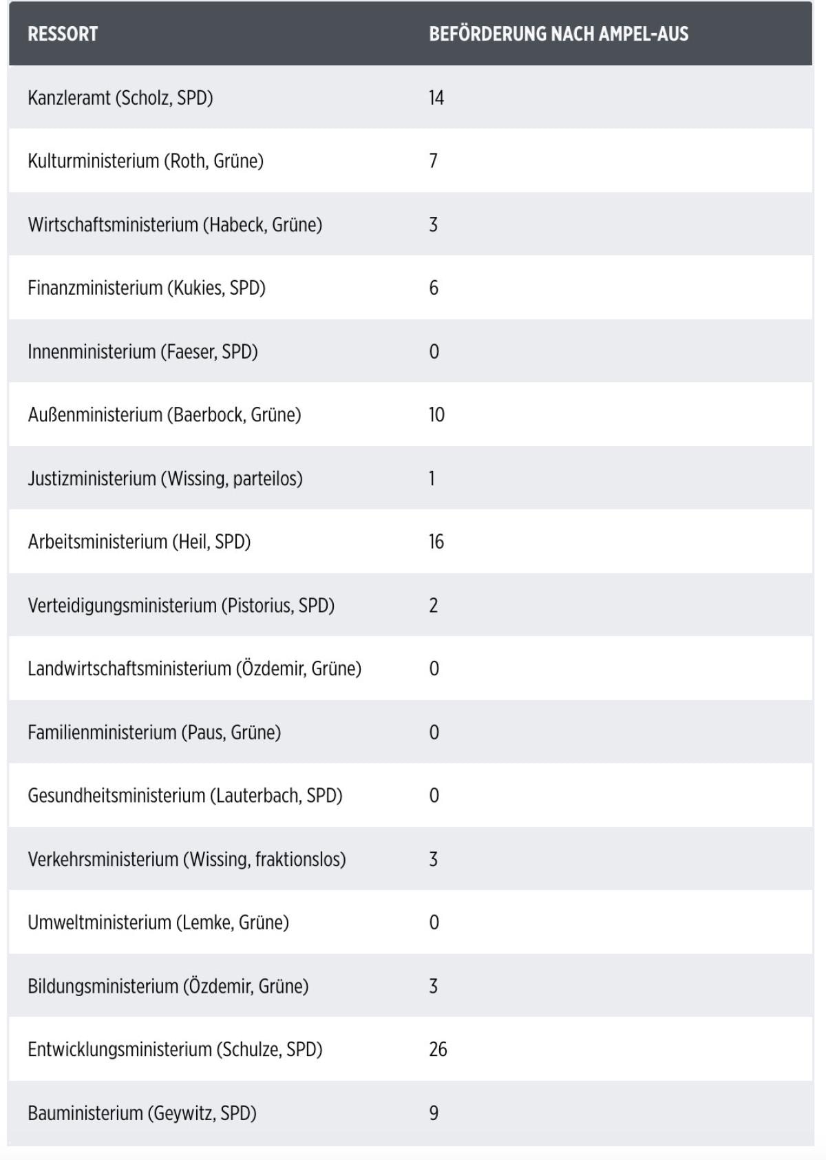 Toplamda, SPD ve Yeşiller, koalisyonun çöküşünden sonra yalnızca iki ayda tam 90 memurun maaş seviyesini yükseltti. Buna karşın, yılın ilk 10 ayında (FDP’nin hükümette olduğu dönemde), tüm bakanlıkların toplamda yalnızca 337 memuru terfi ettirdiği açıklandı.
