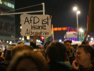 Alexanderplatz'ta toplanan yaklaşık bin kişi, sandıktan üçüncü parti olarak çıkan aşırı sağcı AfD'yi protesto etti.