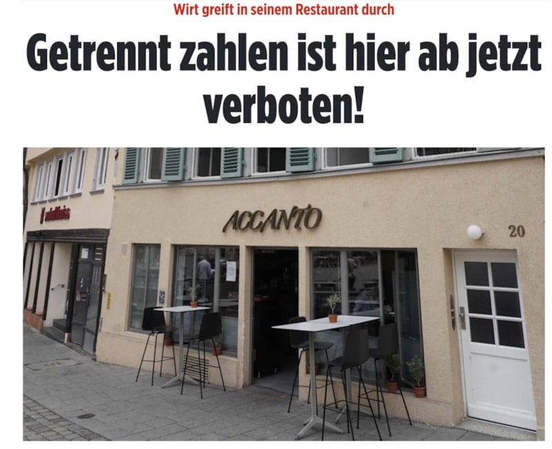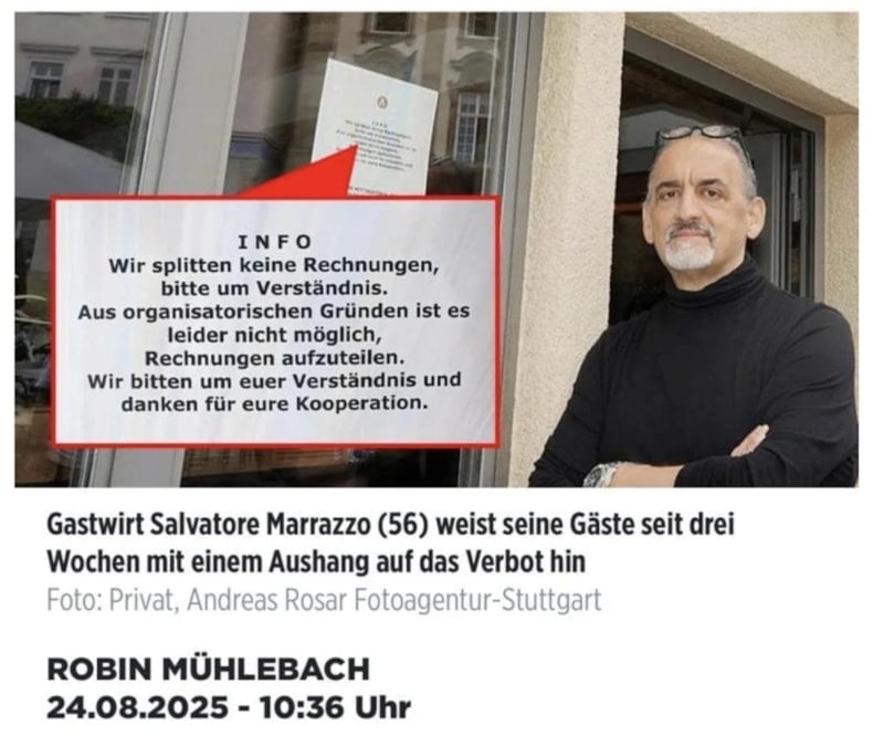 Esslingen şehrinde restoran işleten Salvatore Marrazzo, Alman usulü hesap ödemeyi restoranında yasakladı.