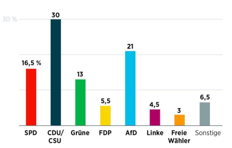 17-20 Kasım tarihlerindeki ankete göre CDU/CSU'nun oy oranı yüzde 24'ten yüzde 30 ulaştı. SPD ve Yeşiller sırasıyla yüzde 25'ten yüzde 16,5'a ve yüzde 14'ten yüzde 13'e geriledi. FDP ise yüzde 11'den yüzde 5,5'a düştü.