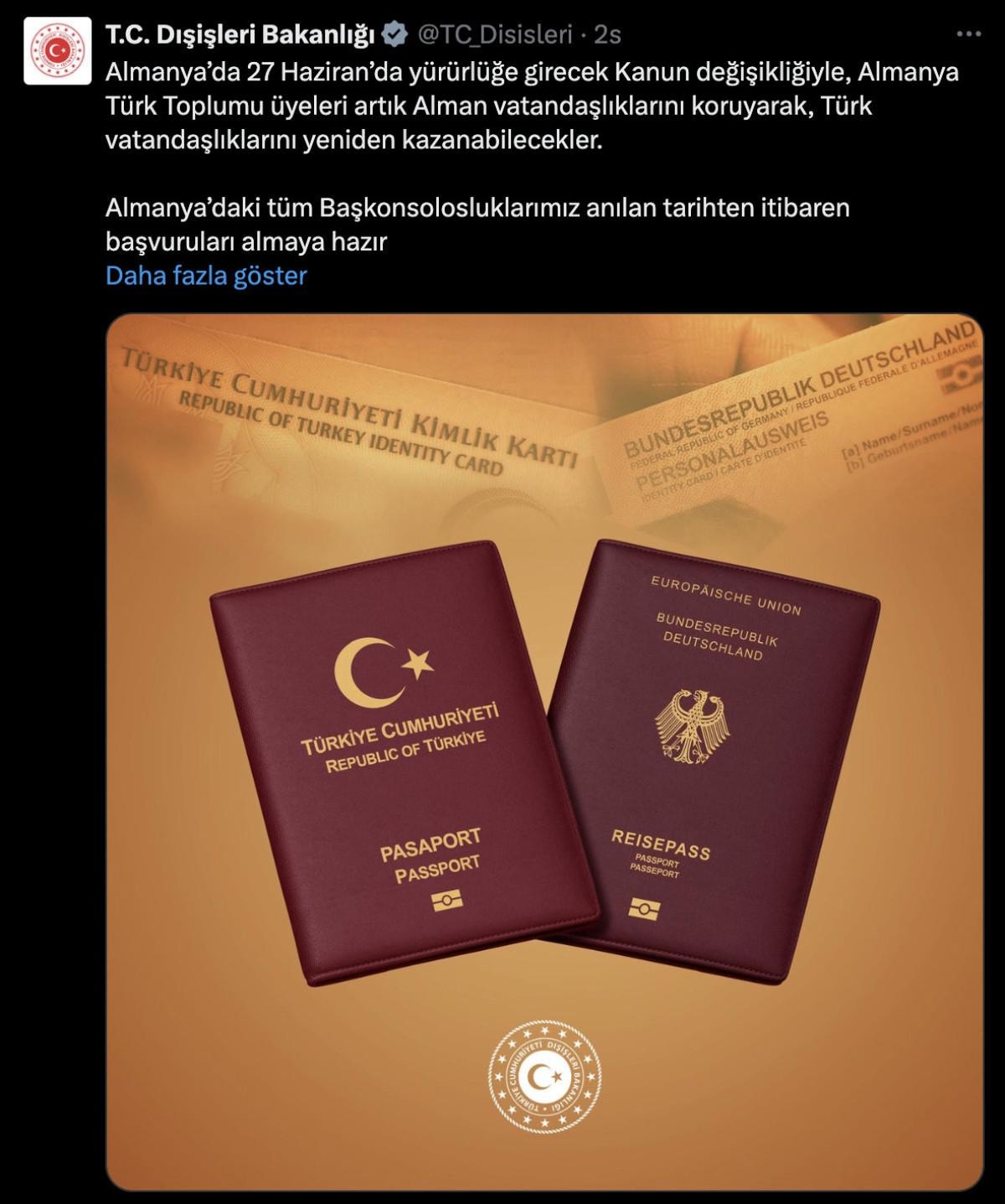 Dışişleri Bakanlığının sosyal medya hesabından yapılan paylaşımda, "Almanya’da 27 Haziran’da yürürlüğe girecek kanun değişikliğiyle Almanya Türk toplumu üyeleri artık Alman vatandaşlıklarını koruyarak, Türk vatandaşlıklarını yeniden kazanabilecekler. Almanya’daki tüm başkonsolosluklarımız anılan tarihten itibaren başvuruları almaya hazır olacaklar. Almanya’daki Türk toplumunun uzun yıllardır beklediği ve hak ettiği söz konusu yasal düzenleme, Türk-Alman ilişkileri bakımından olumlu, anlamlı ve değerli bir gelişme." ifadelerine yer verildi.