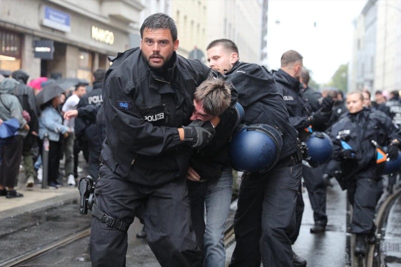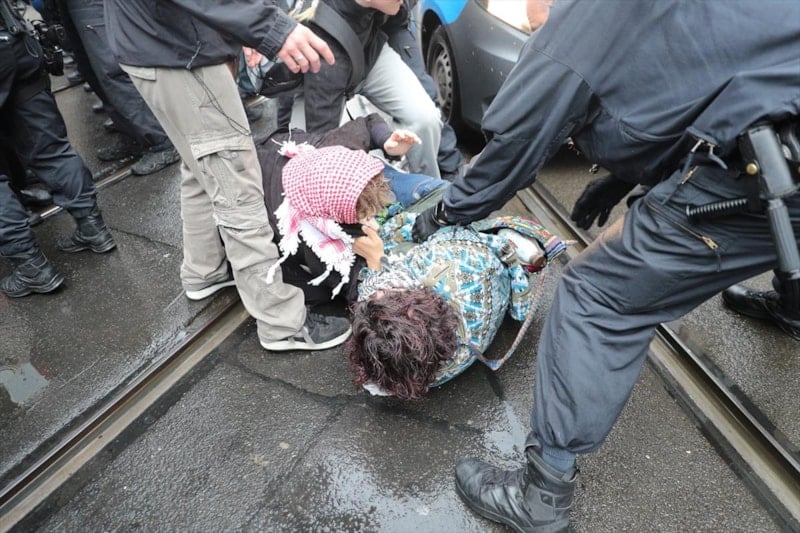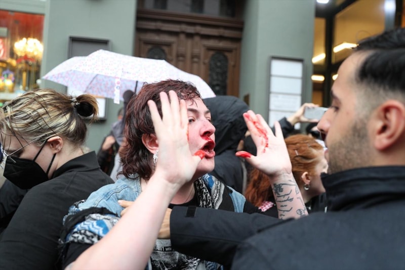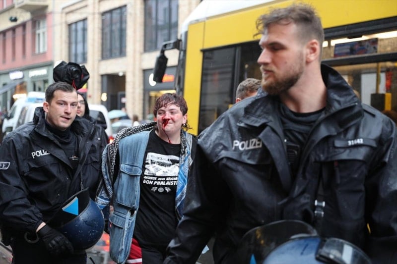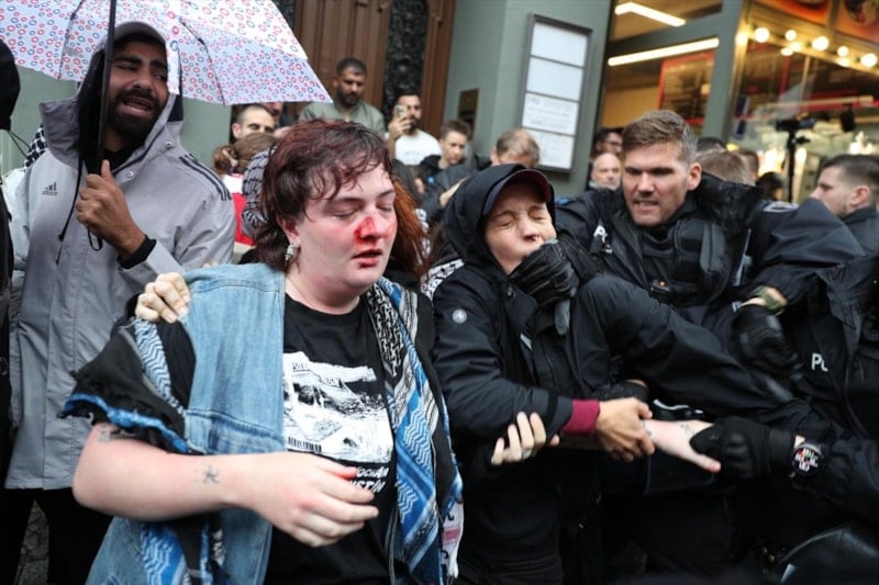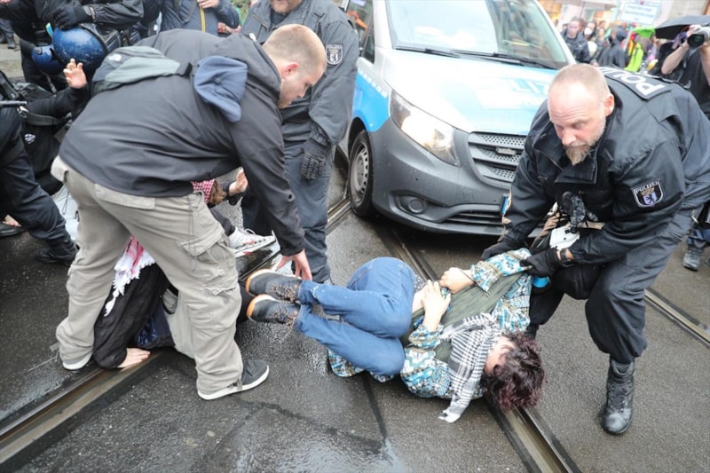 Berlin'de bulunan Hackescher’de, gazetecilerin öldürülmesini ve Gazze’deki soykırımı protesto etmek amacıyla düzenlenen gösteride polis, yumruk attığı kadın göstericiyi gözaltına aldı..