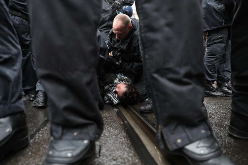 Eylem sırasında polisin yumruk attığı bir kadın yaralandıktan sonra gözaltına alındı. Olay, polis müdahalesinin sertliğiyle dikkat çekti.