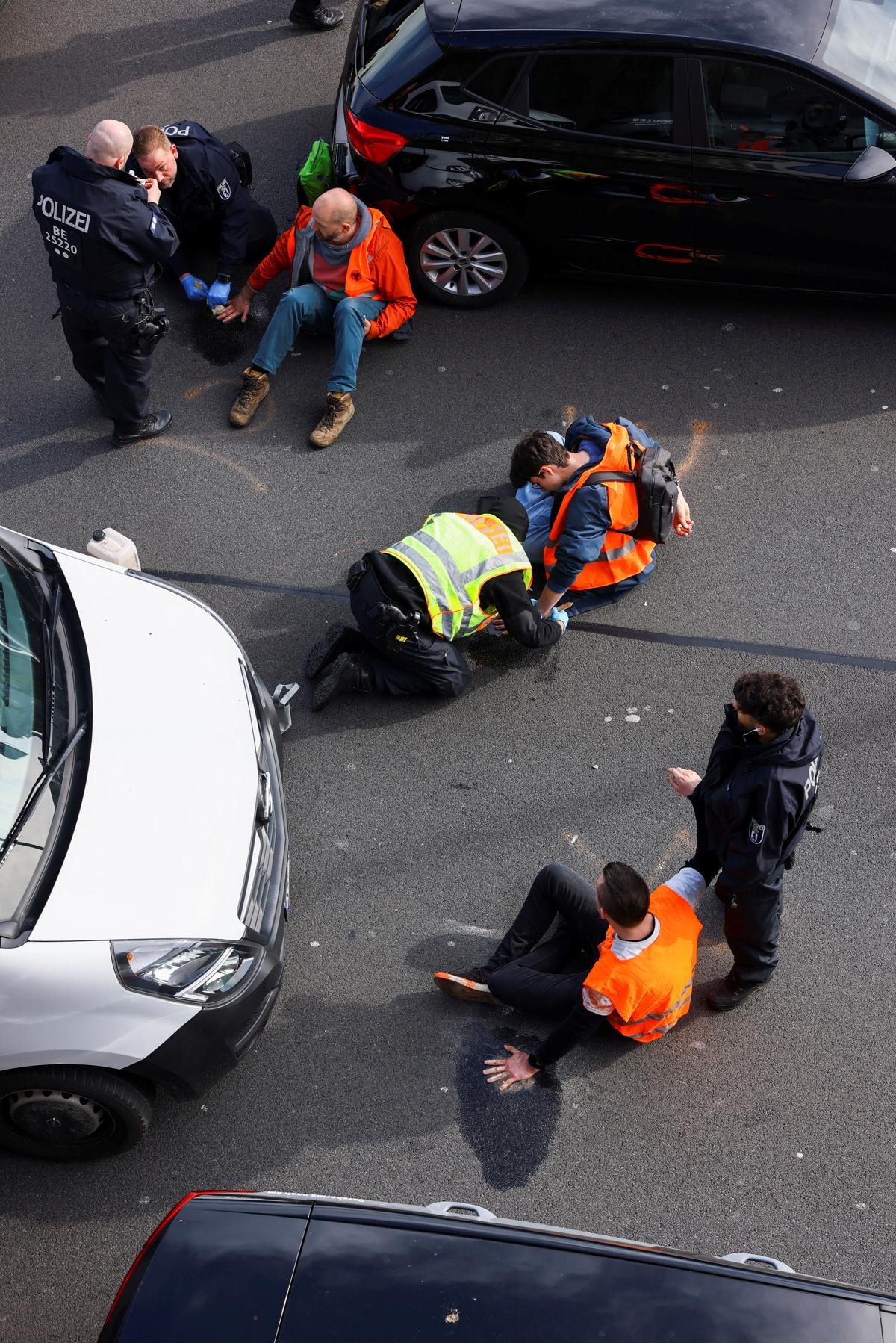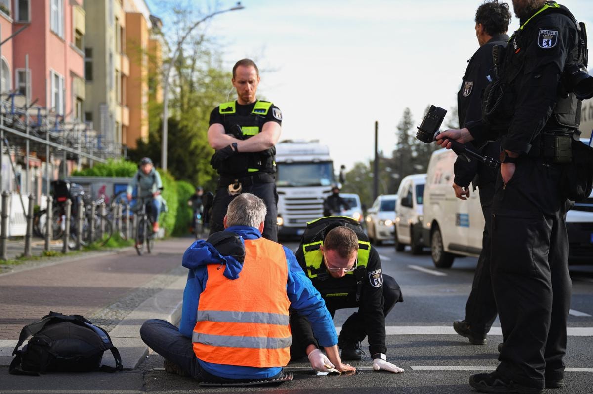 Önceden belirledikleri caddede toplanan iklim aktivistleri, ellerini asfalta yapıştırdı. Olay yerine gelen polisler, özel çözeltilerle aktivistlerin ellerini yapıştırıcıdan temizledi.