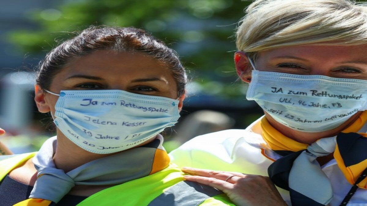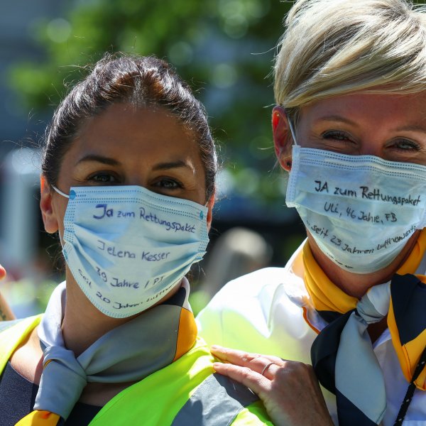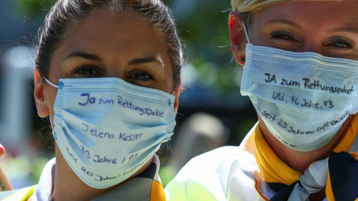 Berlin’de tarihi Brandenburg Kapısı önünde toplanan yüzlerce Lufthansa çalışanı, şirket yönetimine ve hissedarlara söz konusu toplantıda federal hükümetin hazırladığı kurtarma paketini tartışırken kendilerini düşünmelerini talep etti.