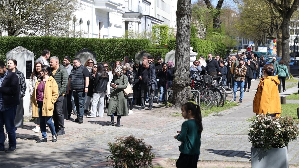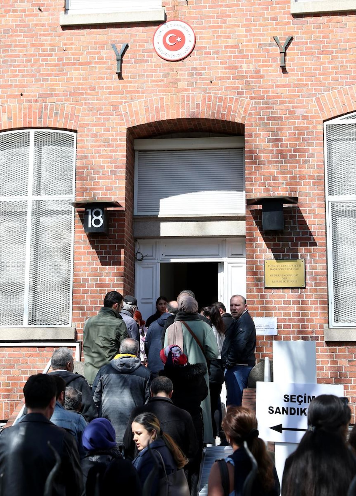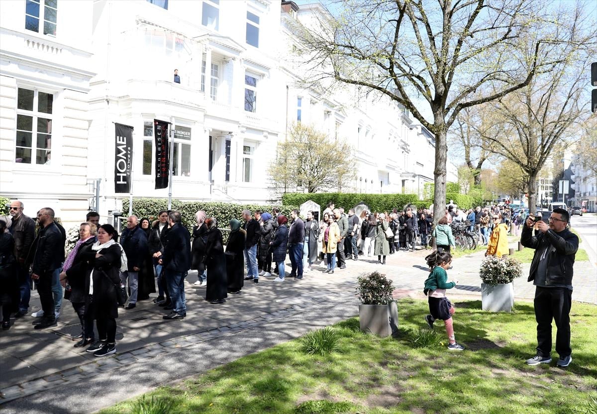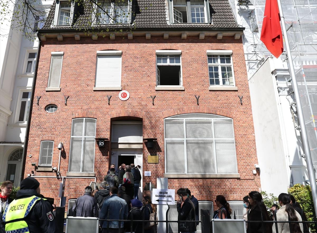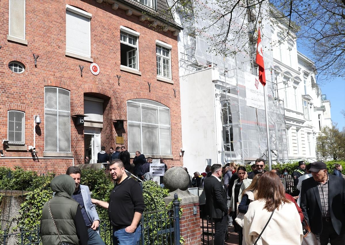 Hamburg Başkonsolosluğu'na gelen yüzlerce seçmen, oy kullanmak için uzun kuyruklar oluşturdu. Yoğun kalabalık objektiflere yansıdı.