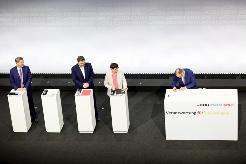 Törende; Koalisyon hükümetinde Başbakanlığı üstlenecek Hristiyan Demokrat Birlik (CDU) Partisi Genel Başkanı Friedrich Merz, Hristiyan Sosyal Birlik (CSU) Partisi Genel Başkanı Markus Söder ve SPD'nin eş başkanları Lars Klingbeil ile Saskia Esken, "Almanya için sorumluluk" başlığını taşıyan 144 sayfalık koalisyon sözleşmesine imza attı.