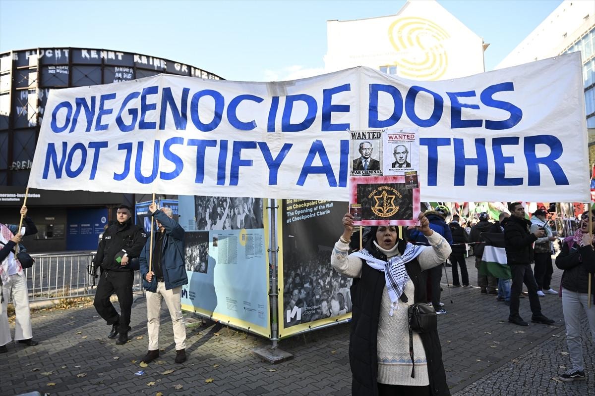 Yaşanan gelişmede, Berlin'in Mitte semtindeki Friedrich ve Zimmer caddelerinin kesiştiği meydanda Filistin'i desteklemek ve İsrail'in işlediği soykırımı protesto etmek için çok sayıda kişi toplandı.