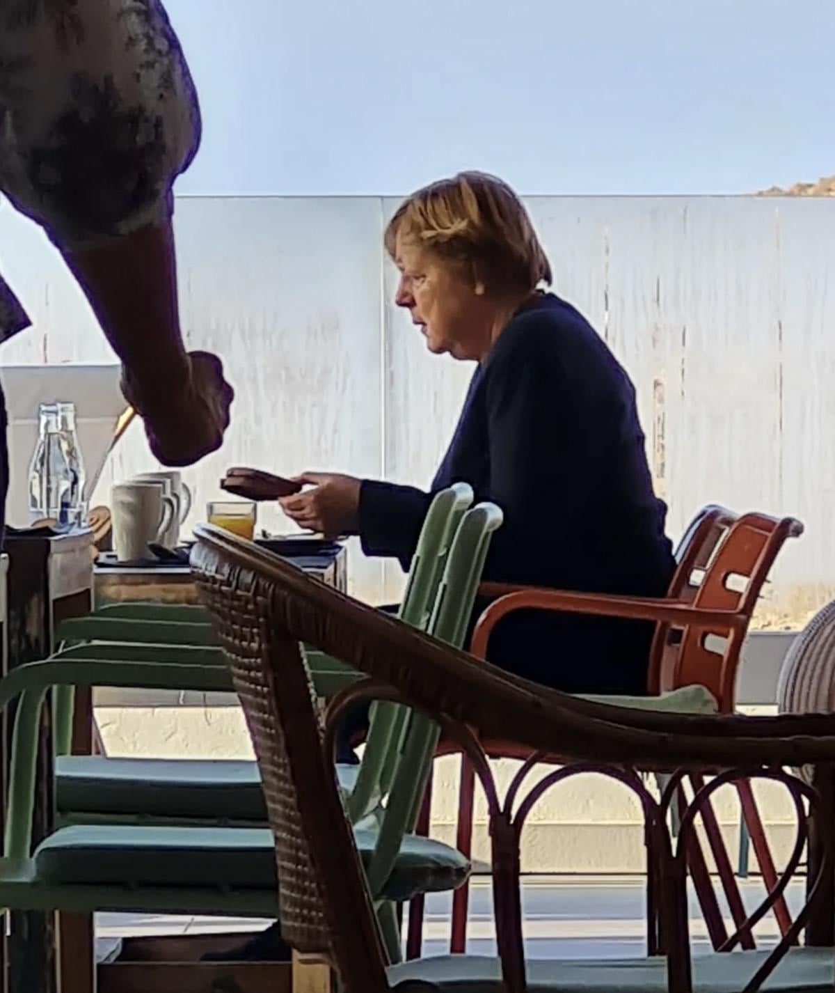 Görüntülerde Merkel'in eşiyle sakin bir şekilde kahvaltı yaptığı görüldü.