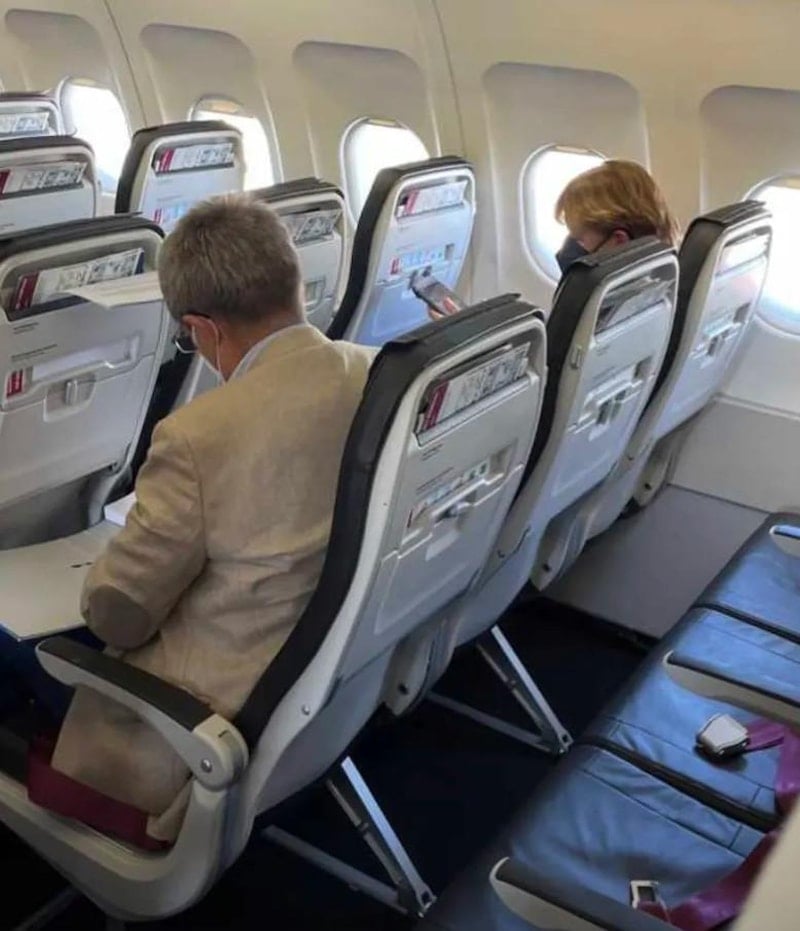 Düsseldorf merkezli Eurowings ile uçan Merkel ve eşi, rezervasyon yaptırdıkları koltuklara yerleşirken görüntülendi.