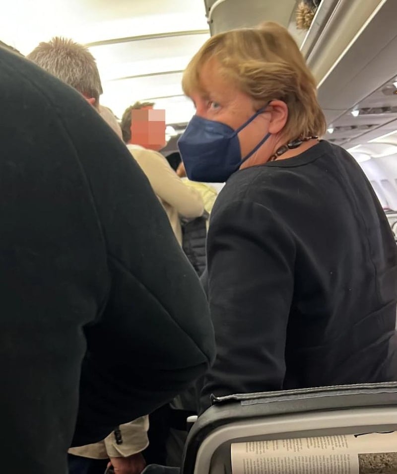 Eşiyle tatile çıkan ve cam tarafında oturan eski Şansölye kameralara yansıdı.