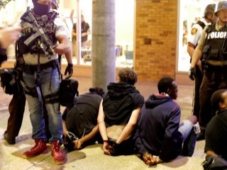 Ellerinde otomatik silahlarla gezen polis ekipleri, göstericileri tersten kelepçeliyor.