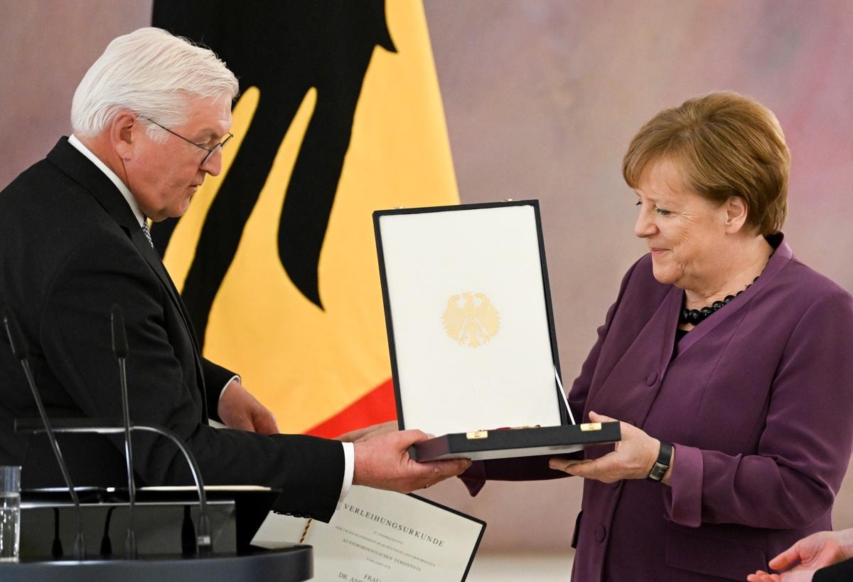 Bellevue Sarayı'nda düzenlenen törenle Merkel'e özel tasarım "Federal Almanya Cumhuriyeti Liyakat Nişanı Büyük Haçı" Almanya Cumhurbaşkanı Frank-Walter Steinmeier tarafından takdim edildi.