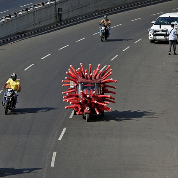 Chennai şehrinde koronavirüs salgınına dikkat çekmek isteyen bir belediye sağlık görevlisi, aracını virüsün yapısına benzer bir şekilde kapladı.