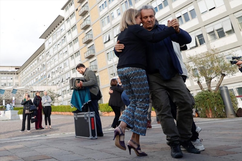 Roma'da Arjantinli dansçılar, uzun süredir tedavi gören Katoliklerin ruhani lideri Papa Francis'e destek vermek amacıyla Gemelli Hastanesi önünde tango performansı sergiledi.
