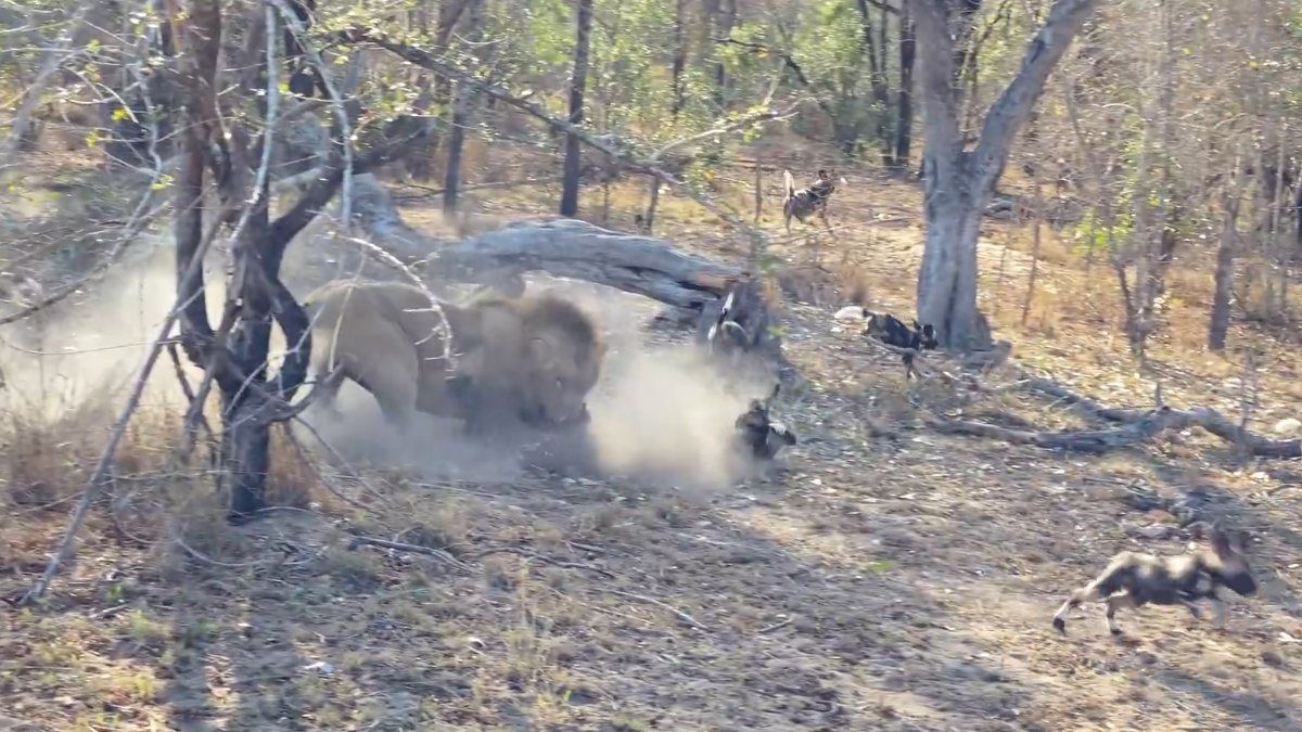 Yavru köpekler, bir süre sonra aslanın yaklaştığını fark etti. Sürü kaçmaya çalıştı ancak aslan, köpeklerden birini yakalamayı başardı.