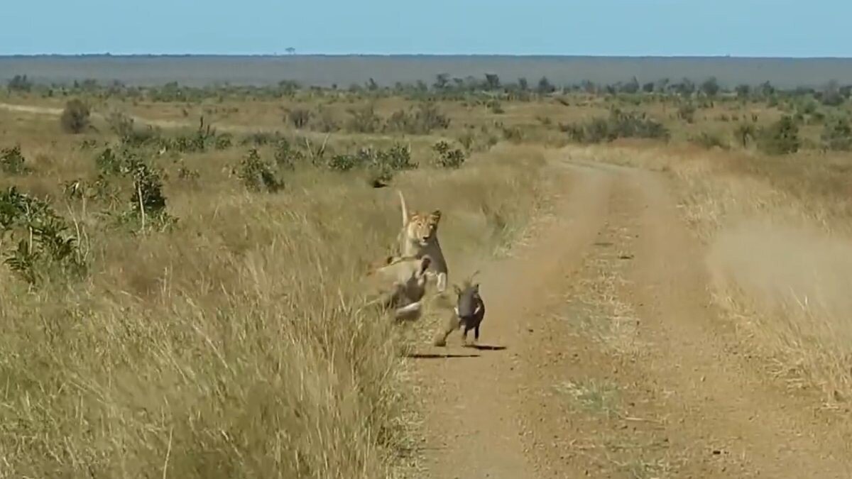 Parkta safari yapan bir grup, yolda ilerleyen domuzu ve onu izleyen aslanları fark etti.