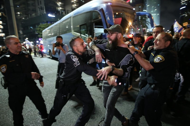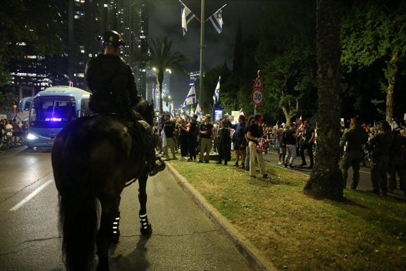 Protestoların merkezi on binlerce İsraillinin akşam saatlerinde toplandığı başkent Tel Aviv'de yer alan, Netanyahu hükümetinin yargı düzenlemelerine karşı yapılan gösterilerde sembolleşen, polisin demir bariyerlerle kapattığı Kaplan Caddesi oldu.