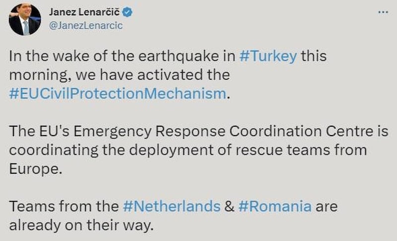 Lenarcic, ilk etapta 10 AB ülkesinin Türkiye'ye arama kurtarma ekipleri göndereceği bilgisini paylaştı.