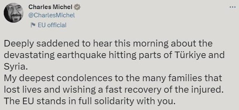 Sabah saatlerinde Türkiye ve Suriye'nin bazı bölgelerini vuran yıkıcı depremi duyunca derinden üzüldüğünü belirten Michel, şöyle yazdı: