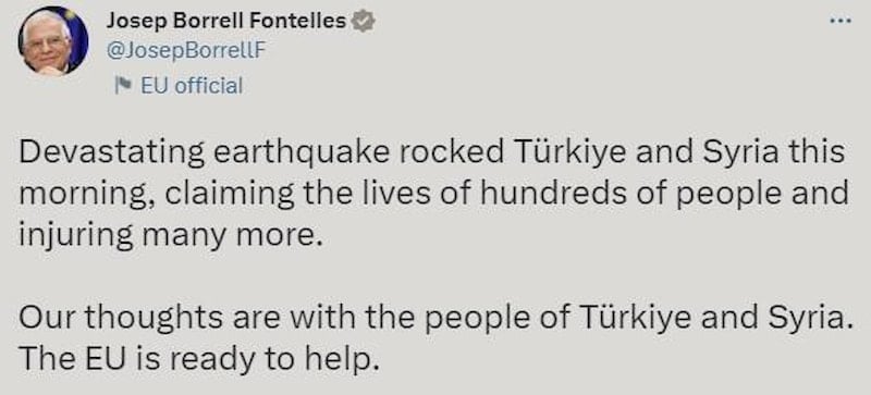 "Düşüncelerimiz Türkiye ve Suriye halklarıyla." diyen Borrell, "AB yardıma hazır." ifadesini kullandı.
