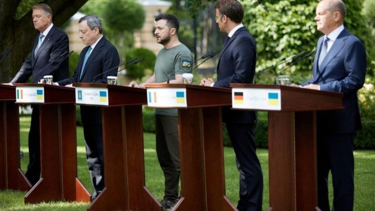 Ukrayna Devlet Başkanı Vladimir Zelensky, Rus saldırıları devam ederken Ukrayna'yı ziyaret eden Fransa Cumhurbaşkanı Emmanuel Macron, Almanya Başbakanı Olaf Scholz, İtalya Başbakanı Mario Draghi ve Romanya Cumhurbaşkanı Klaus Iohannis ile ortak basın toplantısı düzenledi.