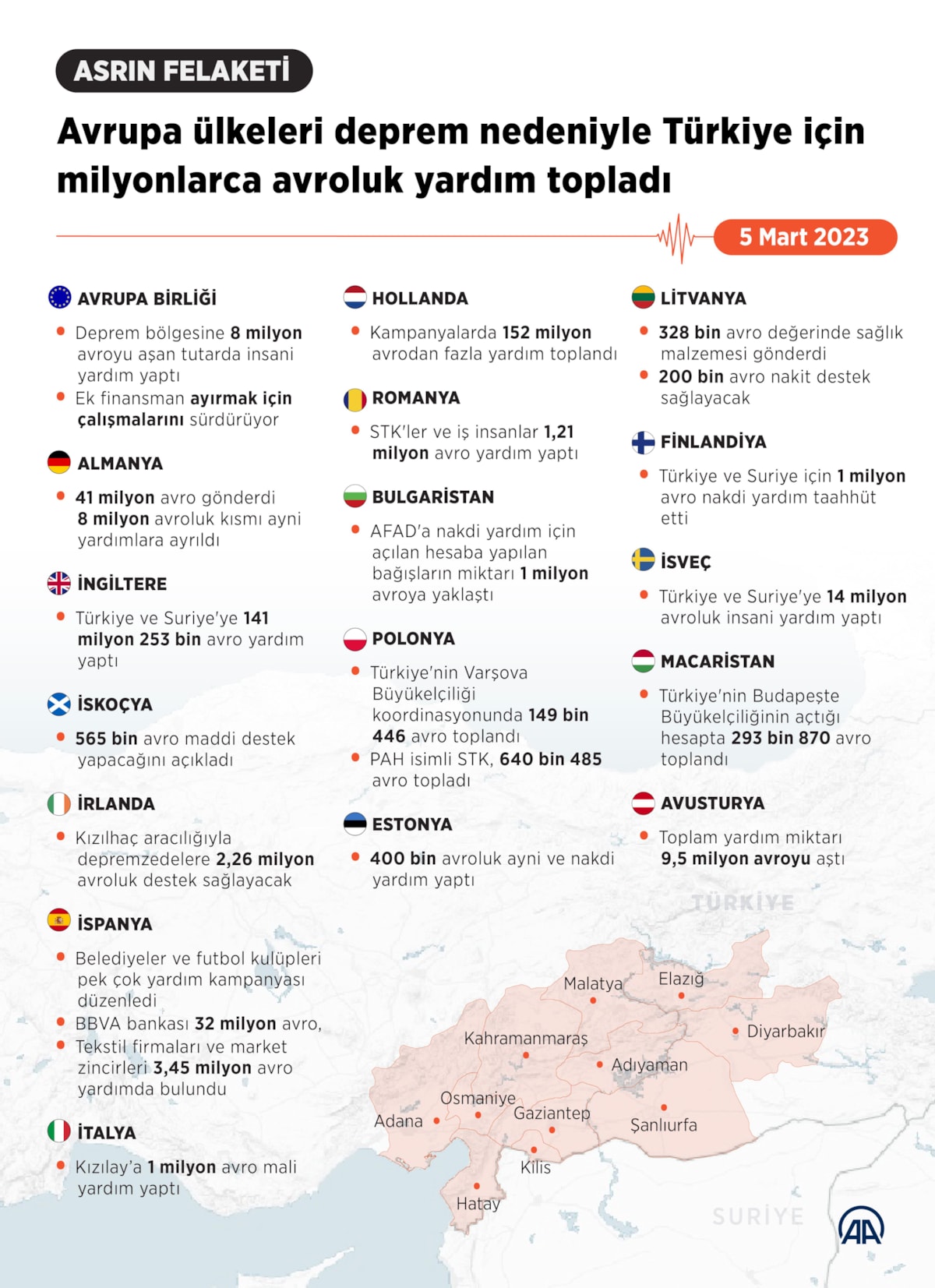 Birçok AB ülkesi Kahramanmaraş merkezli depremlerin ardından Türkiye’ye nakdi yardım toplamak için çeşitli kampanyalar düzenledi.