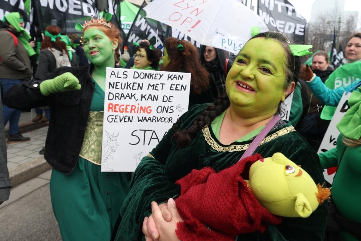 Üç büyük sendikanın katıldığı gösteride; yeşil, kırmızı, mavi kıyafetli sağlık çalışanları, personel eksikliği nedeniyle ağır iş yükü, düşük maaşlar ve elverişsiz çalışma koşullarını eleştiren sloganlar attı, pankartlar taşıdı.