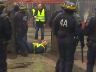 Paris'te meydanlarda kaydedilen bir görüntüde polisler bir göstericiyi yaka paça ederek copladı. Çok sayıda polis tarafından araya alınarak dövülen eylemci yere düşerken dayak burada da devam etti.