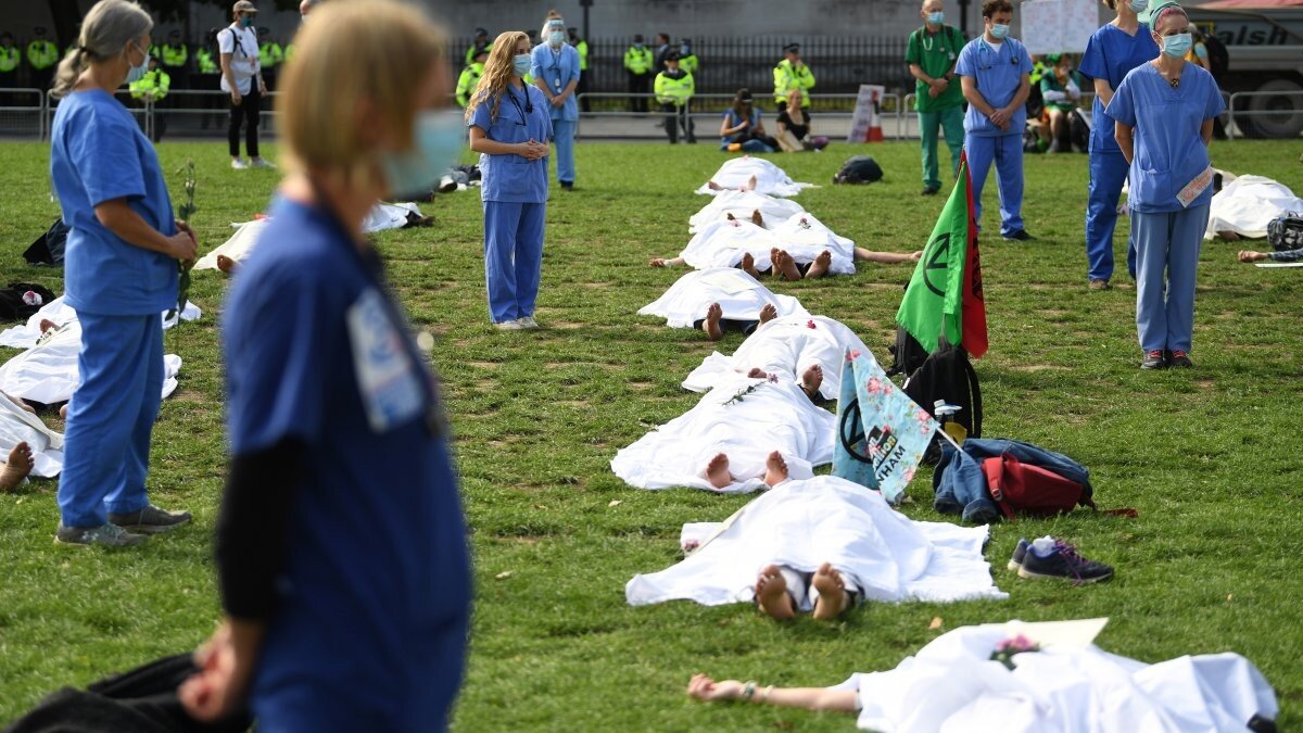 Eylemciler kefen giyerek yere uzanarak sessiz eylem gerçekleştirirken, polisler Parlamento Meydanı, Big Ben ve Başbakanlık ofisi çevresinde geniş güvenlik önlemi aldı.