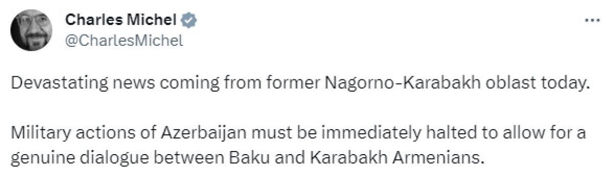 Avrupa Birliği (AB) Konseyi Başkanı Charles Michel, "Dağlık Karabağ bölgesinden bugün kahredici haberler geliyor." ifadesini kullandı.