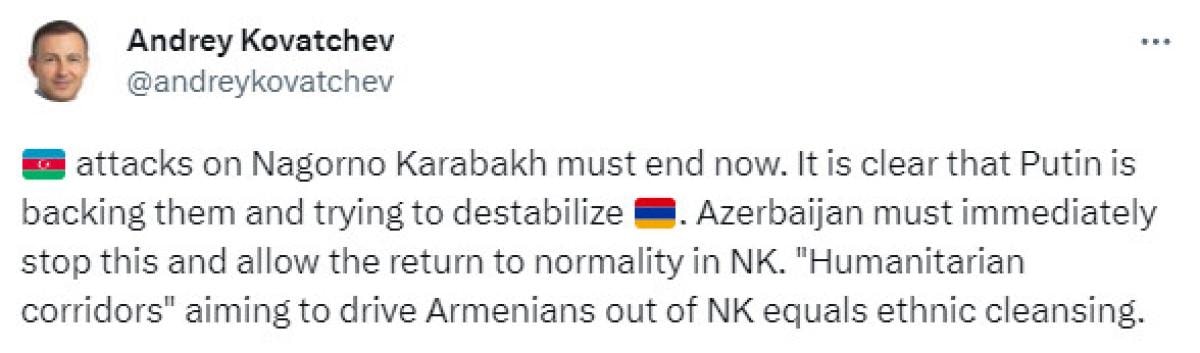 "Azerbaycan buna derhal son vermeli." ifadesini kullanan Kovatçev, Bakü yönetimini üstü kapalı bir biçimde "soykırım" yapmakla suçlamaya çalıştı.