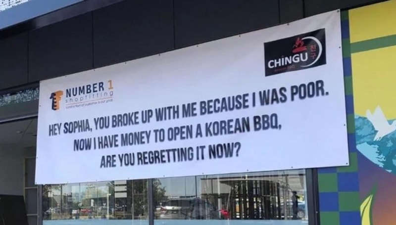 Avustralya'da maddi durumu yetersiz olduğu için sevgilisi tarafından terk edilen şahsın intikamı şaşkına çevirdi. Şahıs açtığı restorana pankart astırarak "Fakir olduğum için benden ayrıldın. Artık Kore restoranı açacak param var. Şimdi pişman mısın?" ifadelerine yer verdi.