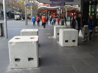 Melbourne kent merkezindeki beton blokların yanı sıra polis ekipleri de muhtemel saldırı riskine karşı halkın yoğun bulunduğu alanlarda devriye geziyor.