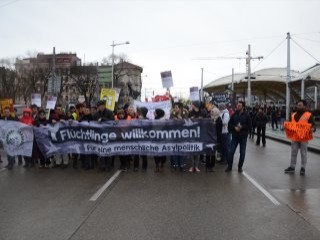 Protestocular, çeşitli ulusların bayraklarının yanı sıra "Sığınmacılar hoş geldi", "Korku yerine özgürlük", "Daha insanca sığınmacı yasası" ve "Müslüman yasağına hayır" yazılı dövizlerle, parlamento binasına yürüdü.
