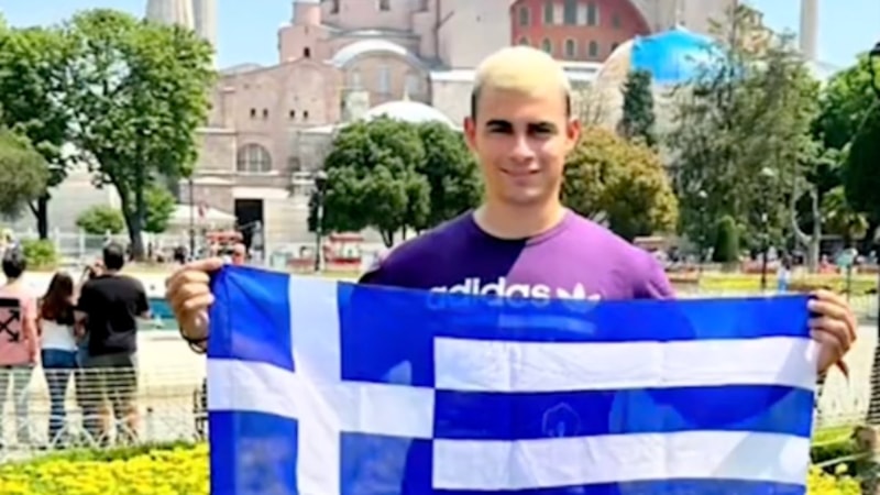 Turist, Ayasofya'nın önünde Yunan bayrağını açarak ve "Bir gün gerçek sahibine dönecek" şeklinde açıklama yaptı.