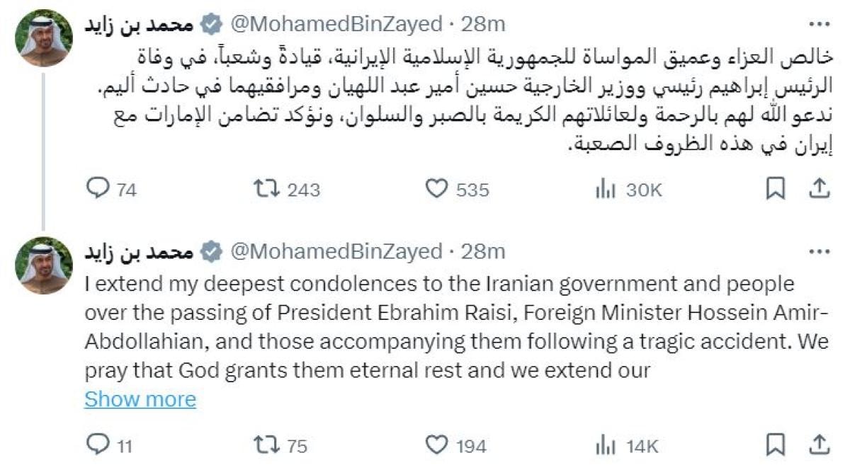 Birleşik Arap Emirlikleri (BAE) Devlet Başkanı Muhammed bin Zayid Al Nahyan, İran Cumhurbaşkanı İbrahim Reisi'nin ölümü üzerine taziye mesajı yayınladı.