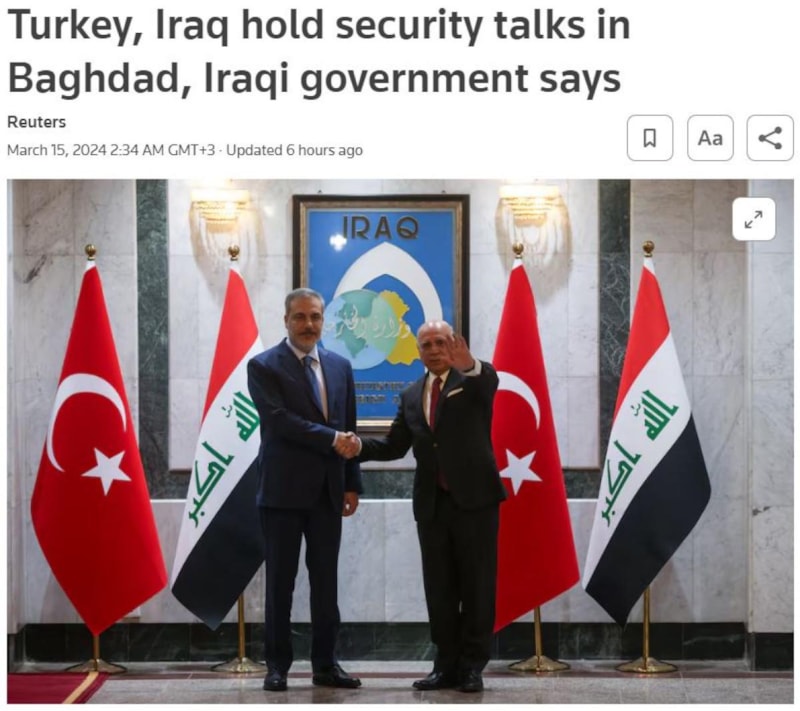 İngiltere merkezli Reuters, Türkiye ile Irak'ın Bağdat'ta güvenlik konusunda görüşmeler gerçekleştirdiğini yazdı.