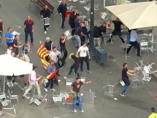 Yerel polisin müdahale ederek ayırdığı gruplar birbirlerine sandalyeler fırlattı. Kavganın İspanya milliyetçisi grubun bir Katalan bayrağı yakmasıyla başladığı belirtildi.