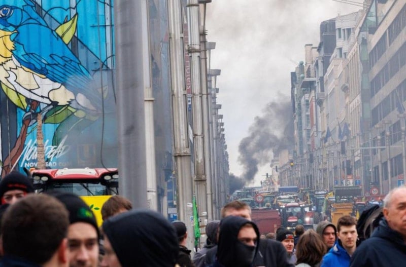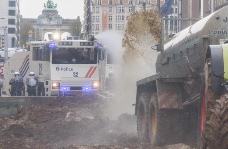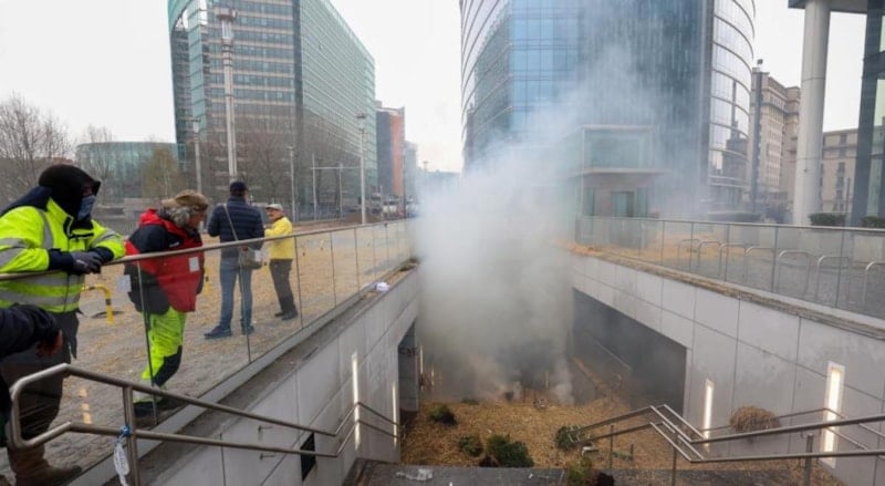 Schuman'da toplanan çiftçiler ise polis barikatlarının önünde ahşap paletleri ateşe verdi, polis tazyikli su sıktı.
