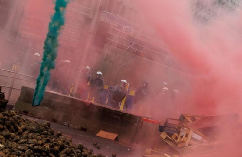 Polis barikatlarına saman ve hayvan gübresi püskürten çiftçiler, yumurta ve sis bombası fırlattı.