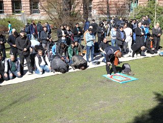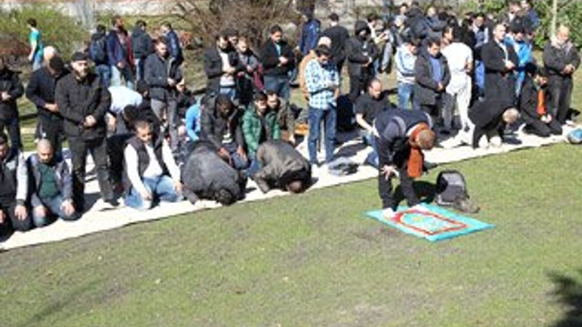 Müslüman öğrenciler cuma namazını eda etmek için üniversitenin ana binasının arkasında bulunan bahçede toplanıyor. Buradaki çimlere serdikleri karton ve seccadeler üzerinde oturan ve hutbeyi dinleyen öğrenciler daha sonra cuma namazını kılıyorlar.