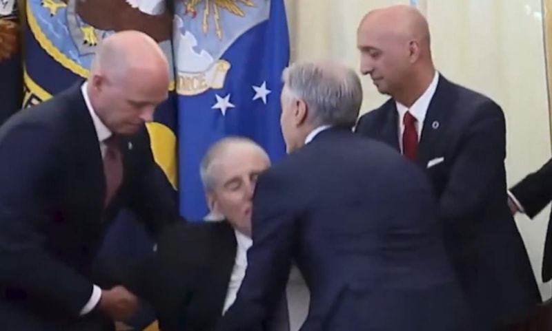 ABD Başkanı Trump’ın zayıflama ilaçları açıklaması sırasında Novo Nordisk yöneticisi Gordon Findlay fenalaştı. Dr. Mehmet Öz, Findlay’i düşmeden yakalayıp ilk müdahaleyi yaparken, Trump'ın umursamaz tavrı dikkat çekti.